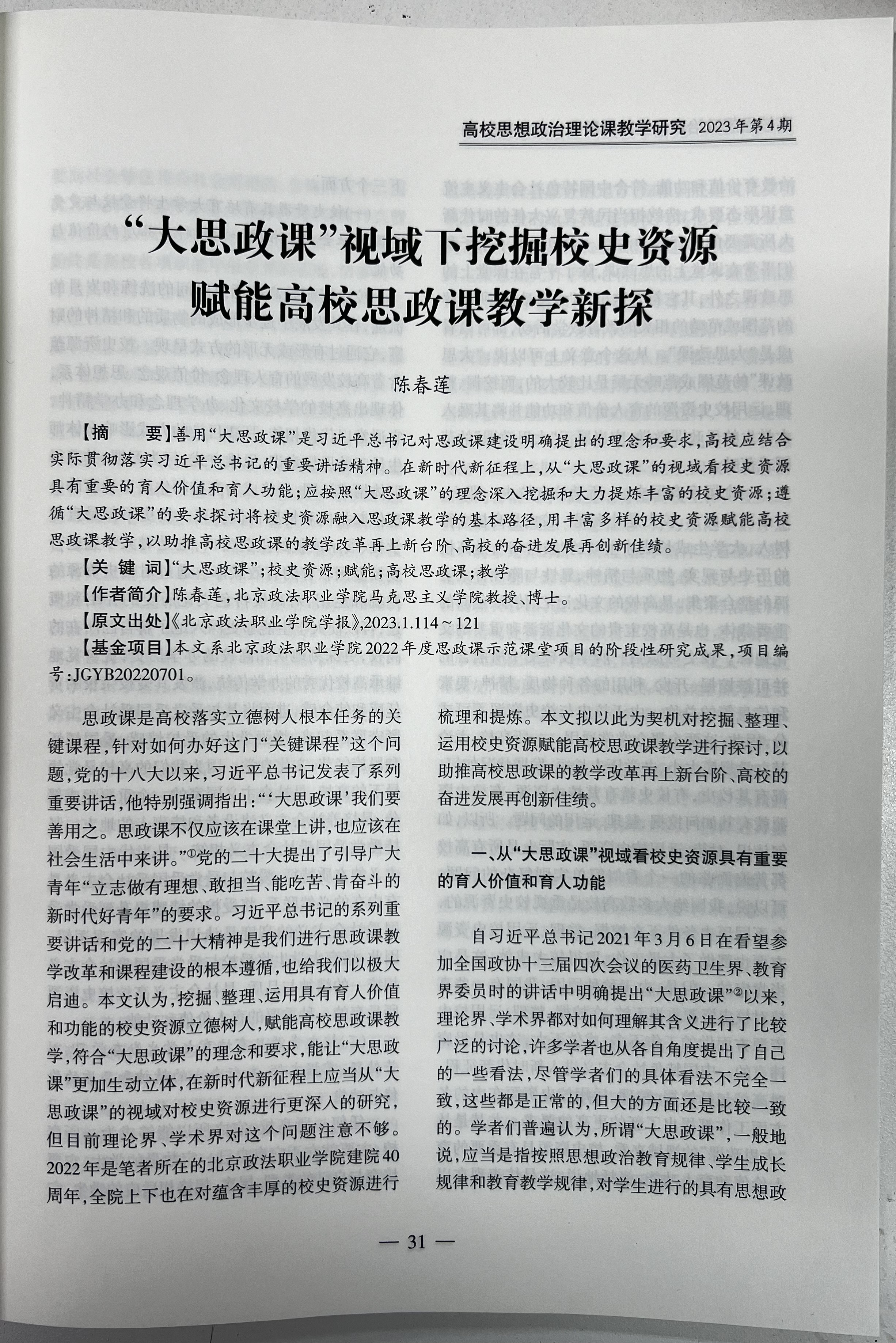 我院马克思主义学院陈春莲教授撰写并发表于《北京政法职业学院学报》2023年第1期的论文《“大思政课”视域下挖掘校史资源赋能高校思政课教学新探》(全文11500余字),被中国人民大学复印报刊资料《高校思想政治理论课教学研究》2023年第4期全文复印转载。